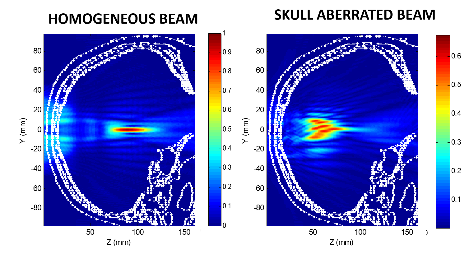 Challenge One major challenge for transcranial FUS is propagating the ultrasound through the skull; the varying thickness of the skull causes beams traveling from different paths to not add constructively, resulting in changes to the location, shape and intensity of the beam’s focus. Figure below shows the beam patterns in a homogeneous medium and through a human skull without correction of these aberrations.